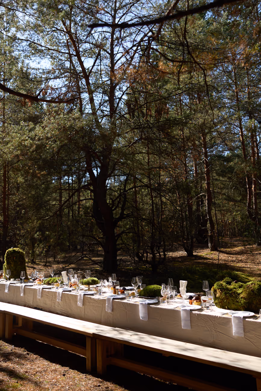 Later — a long table set among the pines, a fire, a homemade lunch, and conversations that stay with you for years.