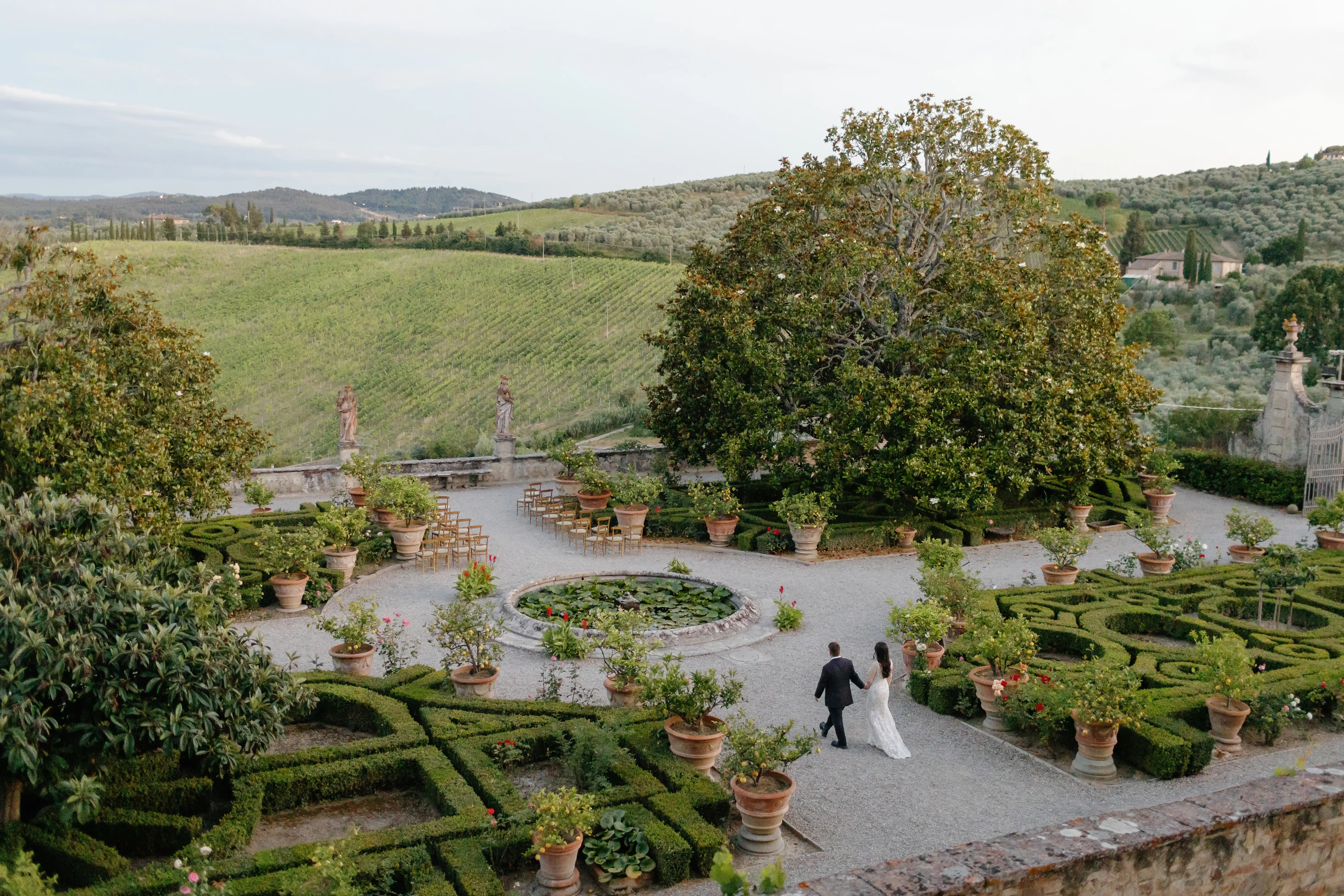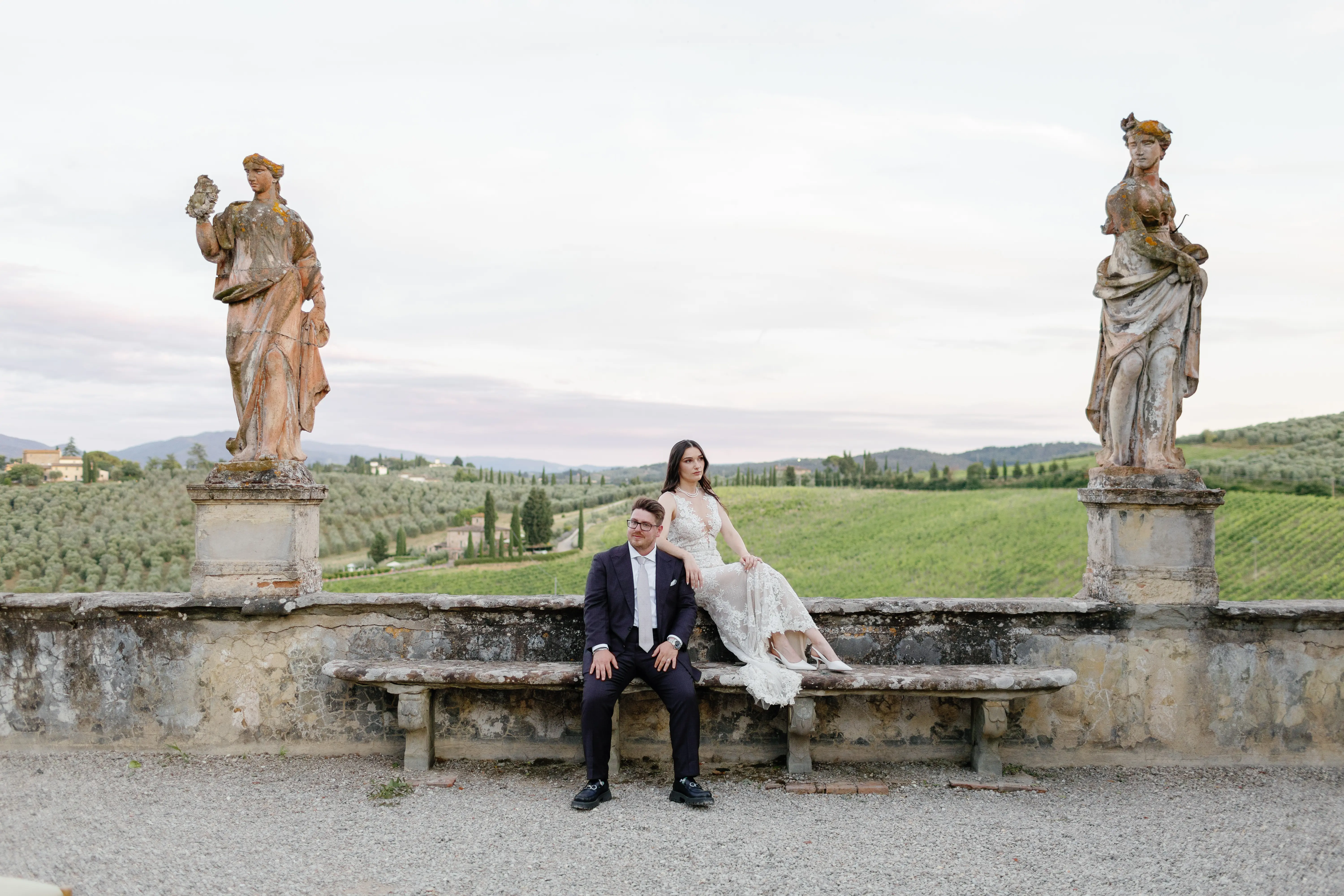 The ceremony took place in the heart of the Tuscan landscape — surrounded by greenery, views, and timeless sculptures.